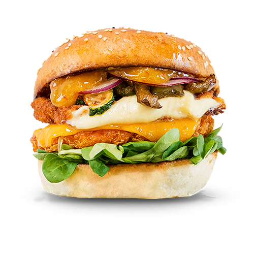 knusprig frittierte Süßkartoffelstäbchen, belegt mit veganem Käse und einer süß-scharfen Chili-Sauce